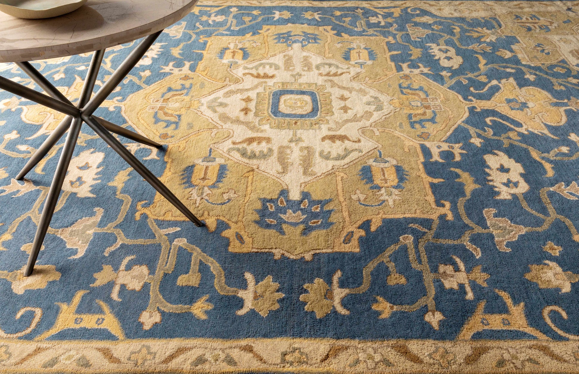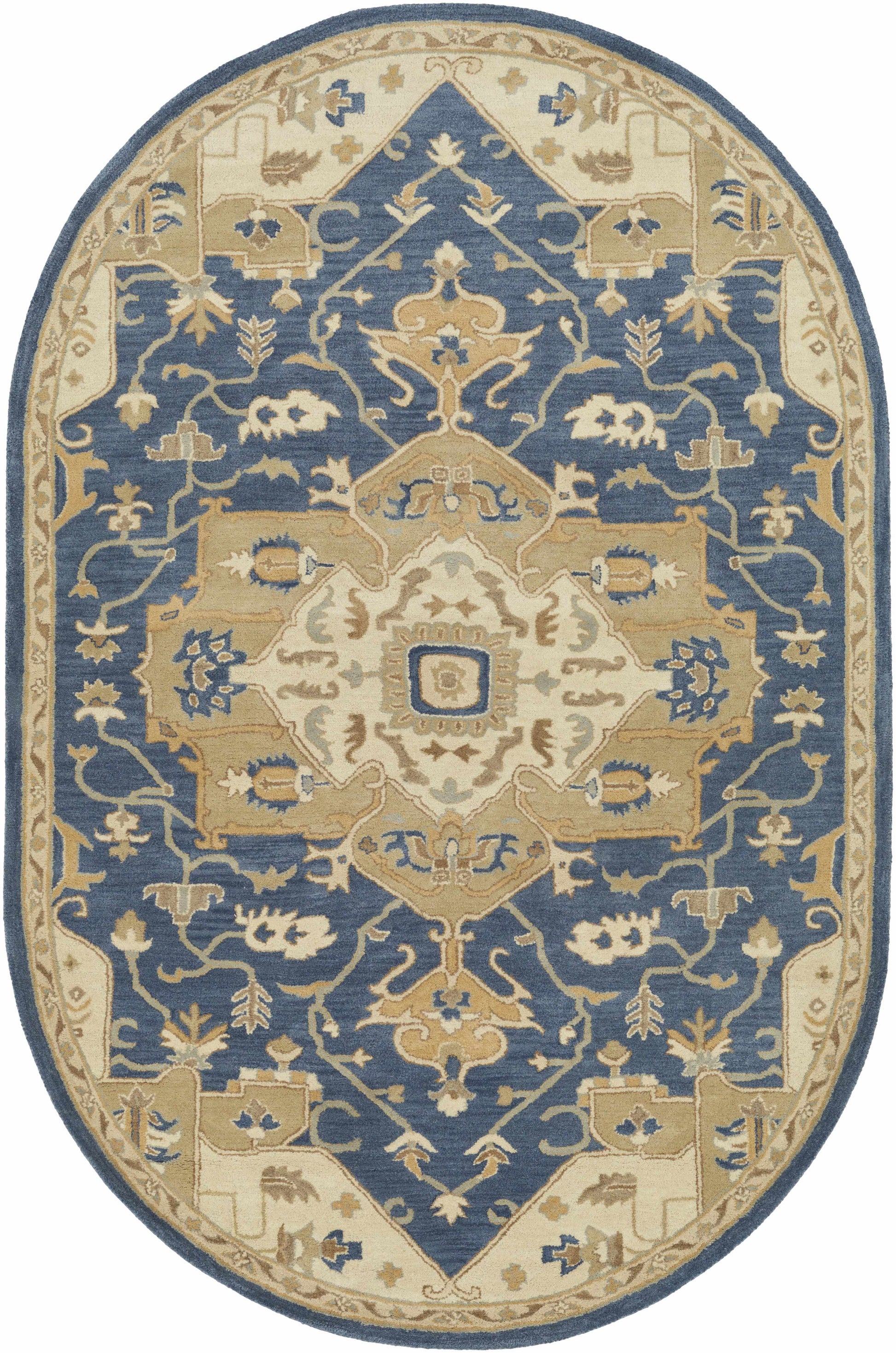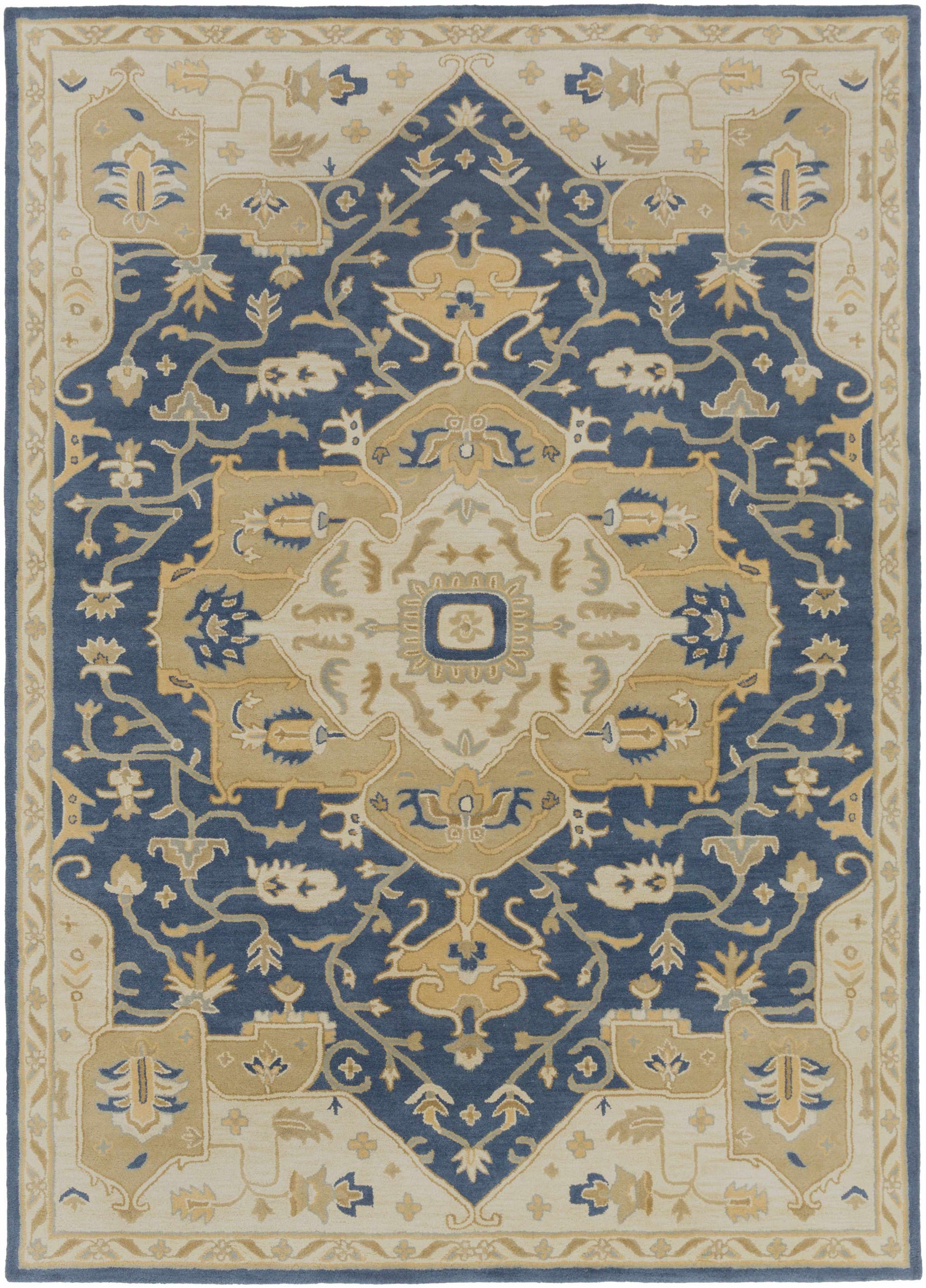 | About: | A traditional vintage Persian-style rug with a modern twist. This beautiful rug is hand tufted with 100% wool, making it extremely durable and long-lasting. It's also available in various shapes and sizes including round, square, runner, oval, hearth The subtle colors of blue and tan are perfect for any traditional decor. |