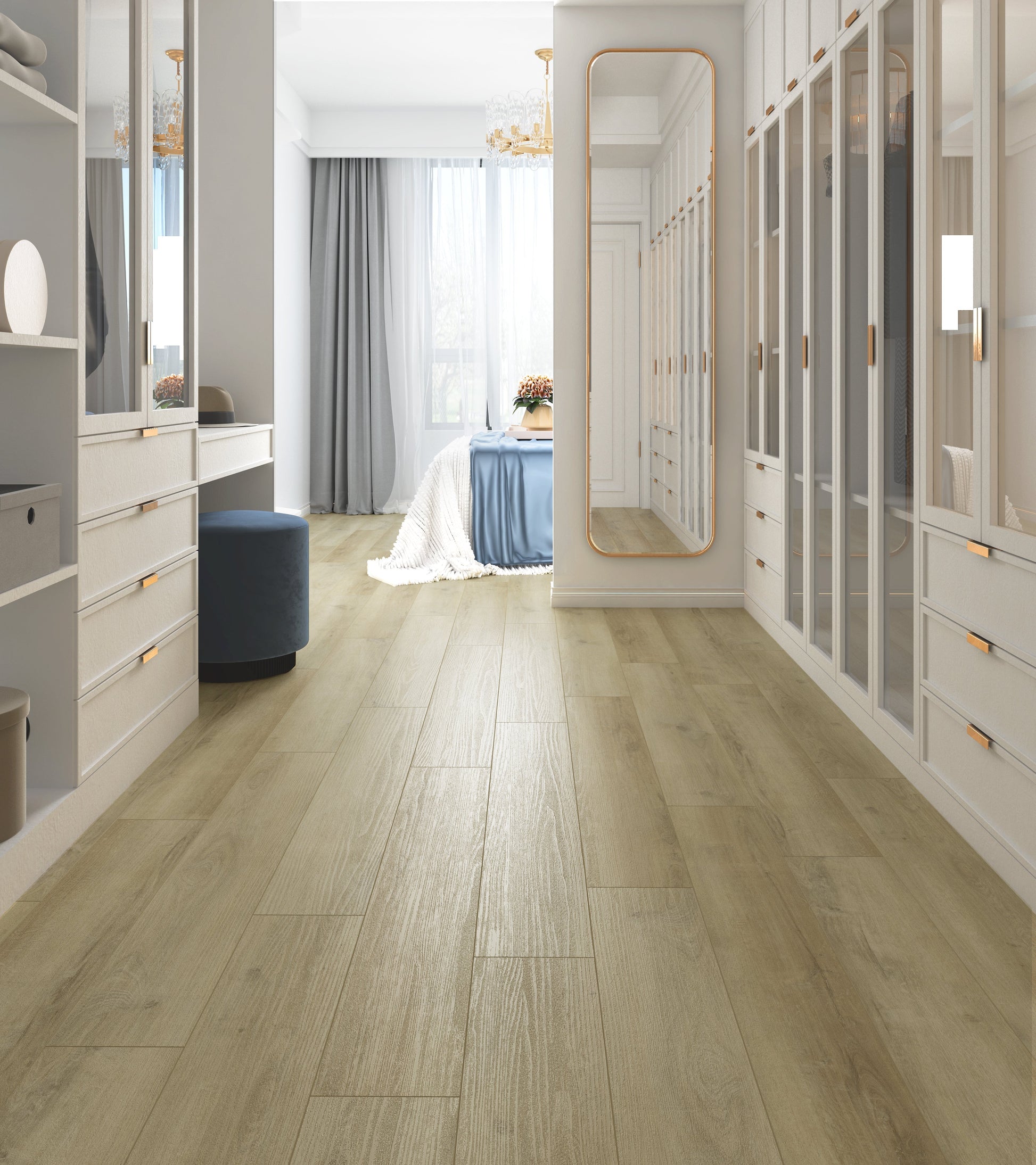 These waterproof vinyl floors are constructed with a 1mm-thick pre-attached cork underpad backing that provides sound absorption and added comfort underfoot.
